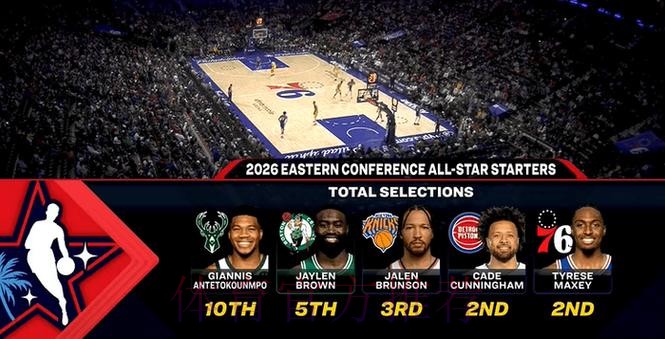 东部全明星首发入选全明星次数:字母哥10次、杰伦-布朗5次